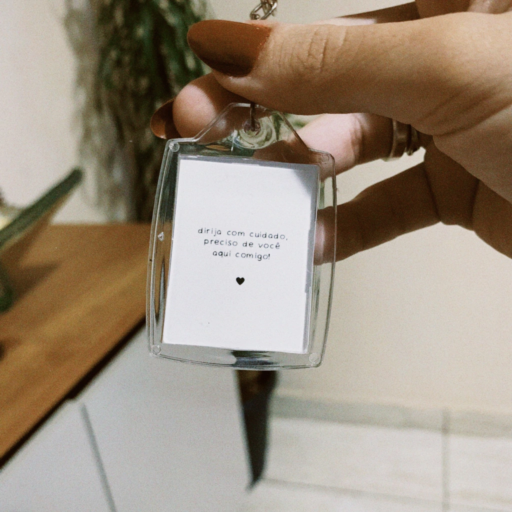 Este chaveiro de 5x4cm é perfeito para quem valoriza a segurança e o carinho nas viagens. Na frente, você pode personalizá-lo com uma foto especial. No verso, a frase "dirijacom cuidado, preciso de você aqui comigo!" traz uma mensagem de amor e cuidado.