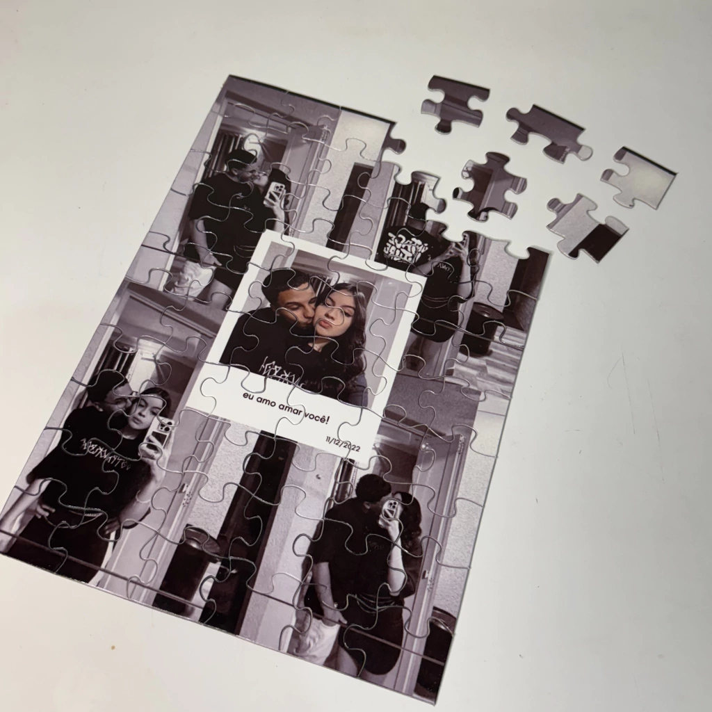 O Quebra-Cabeça Moments é uma maneira especial de eternizar lembranças em um formato interativo e único. Com um design exclusivo, ele combina 4 fotos de fundo em colagem e uma imagem central em estilo polaroid, onde você pode adicionar uma frase personalizada para tornar o momento ainda mais significativo.